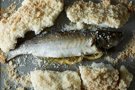 Author Notes: The first time I tasted Pesce al Sale was at a restaurant in Milan. I remember the dramatic presentation of the baked fish encrusted in salt and cracked open tableside, revealing a steaming, aromatic and succulent fish. This preparation is my favorite way to eat a whole fish, and it's easy to do at home Dermes. Have your fishmonger clean and scale your fish for you. Once cooked, filet the fish and serve simply with extra-virgin olive oil, lemon and parsley gremolata. Note that since the fish cavity is stuffed the cooking time will run about 10 minutes longer than unstuffed.