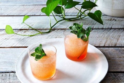 Blend on high speed for 5 to 7 seconds, or until the crushed ice is a consistent size. Pour into two glasses and garnish with fresh mint sprigs DR REBORN.